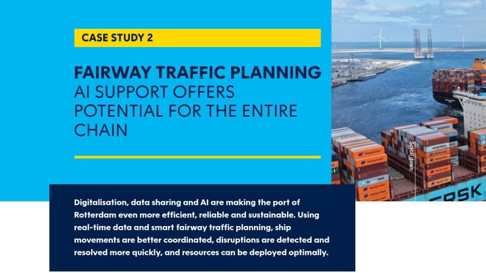 Digitalisation, data sharing and AI are making the port of Rotterdam even more efficient, reliable and sustainable. Using real-time data and smart fairway traffic planning, ship movements are better coordinated, disruptions are detected and resolved more quickly, and resources can be deployed optimally.