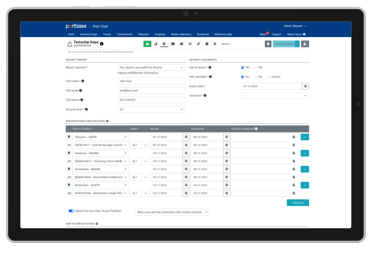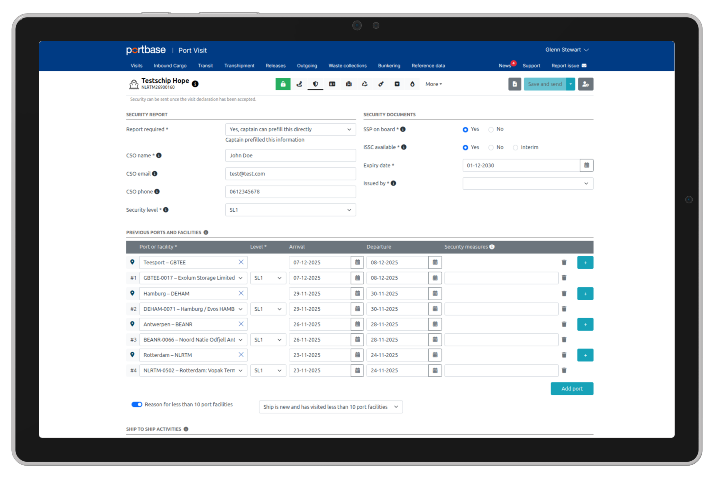 Working with Port Clearance Software also means a reduction in the burden on Sascha Boekee, Tanker Operator at Vertomcory Agencies. In Rotterdam, he reports port calls for E&S Tankers’ vessels via Portbase. He collects crew data, ISPS information, the storage list and the waste form, and processes stowage data. ‘In the past, this involved a lot of phone calls,’ says Boekee. ‘Now I receive the pre-arrival information directly from the software on board. I check that everything is correct and rectify any errors. I then share the data with Portbase via an API link. In time, captains will also be able to share information directly with Portbase, although this will never be fully complete.