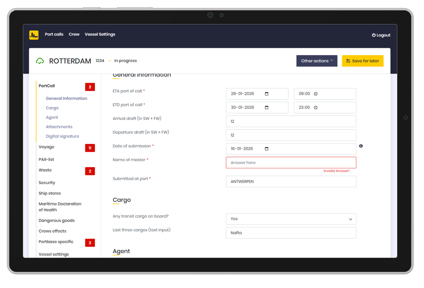 ‘Captains often spend three to four hours per port call on administrative documentation, which is at the expense of their core tasks. Our software collects the necessary data for port clearance, communicates with other systems on board, and generates the required documents for each port. Previously supplied data is reused, so captains only have to enter information once. In addition, the software automatically identifies missing information. It guides the captain step by step during the port call.’