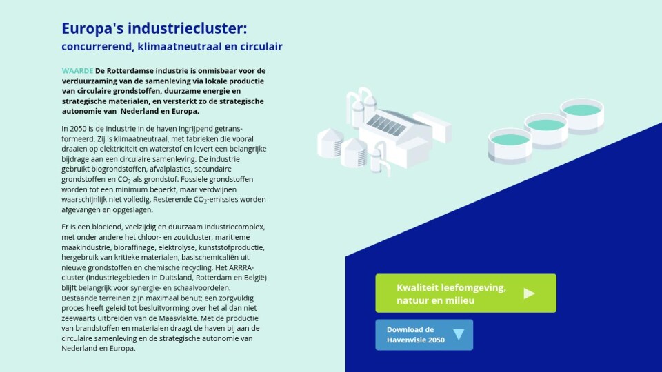 In 2050 is de industrie in de haven ingrijpend getrans- formeerd. Zij is klimaatneutraal, met fabrieken die vooral draaien op elektriciteit en waterstof en levert een belangrijke bijdrage aan een circulaire samenleving. De industrie gebruikt biogrondstoffen, afvalplastics, secundaire grondstoffen en CO2 als grondstof. Fossiele grondstoffen worden tot een minimum beperkt, maar verdwijnen waarschijnlijk niet volledig. Resterende CO2-emissies worden afgevangen en opgeslagen.