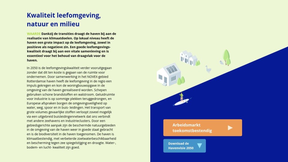 In 2050 is de leefomgevingskwaliteit verder vooruitgegaan zonder dat dit ten koste is gegaan van de ruimte voor ondernemen. Door samenwerking in het NOVEX-gebied Rotterdamse haven heeft de leefomgeving in de regio een impuls gekregen en kon de woningbouwopgave in de omgeving van de haven gerealiseerd worden. Schepen gebruiken schone brandstoffen en walstroom. Geluidruimte voor industrie is op sommige plekken teruggedrongen, en Europese afspraken borgen de omgevingsveiligheid op water, weg, spoor en in buis- leidingen. Het transport van grote volumes gevaarlijke stoffen verloopt zoveel mogelijk via een uitgebreid buisleidingennetwerk dat ons verbindt met andere zeehavens en industrieclusters. Door een gebiedsgerichte aanpak zijn de beschermde natuurgebieden in de omgeving van de haven weer in goede staat gebracht en is de biodiversiteit in de haven toegenomen. De haven is klimaatbestendig, met verbeterde zoetwaterbeschikbaarheid en bescherming tegen zeeĀ spiegelstijging en droogte. Water-, bodem- en lucht- kwaliteit zijn goed.