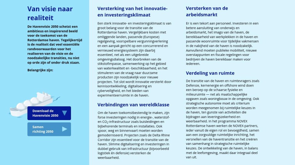 De Havenvisie 2050 schetst een ambitieus en inspirerend beeld voor de toekomst van de Rotterdamse haven. Tegelijkertijd is de realiteit dat veel essentiële randvoorwaarden voor het realiseren van de visie en de noodzakelijke transities, nu niet op orde zijn of onder druk staan.