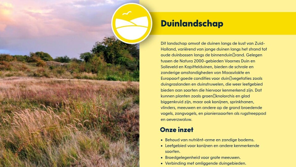 Dit landschap omvat de duinen langs de kust van Zuid-Holland, variƫrend van jonge duinen langs het strand tot oude duinbossen langs de binnenduinrand. Gelegen tussen de Natura 2000-gebieden Voornes Duin en Solleveld en Kapittelduinen, bieden de schrale en zanderige omstandigheden van Maasvlakte en Europoort goede condities voor duinvegetaties zoals duingraslanden en duinstruwelen, die weer leefgebied bieden aan soorten die hiervoor kenmerkend zijn. Dat kunnen planten zoals groenknolorchis en glad biggenkruid zijn, maar ook konijnen, sprinkhanen, vlinders, meeuwen en andere op de grond broedende vogels, zangvogels, en pionierssoorten als rugstreeppad en oeverzwaluw.