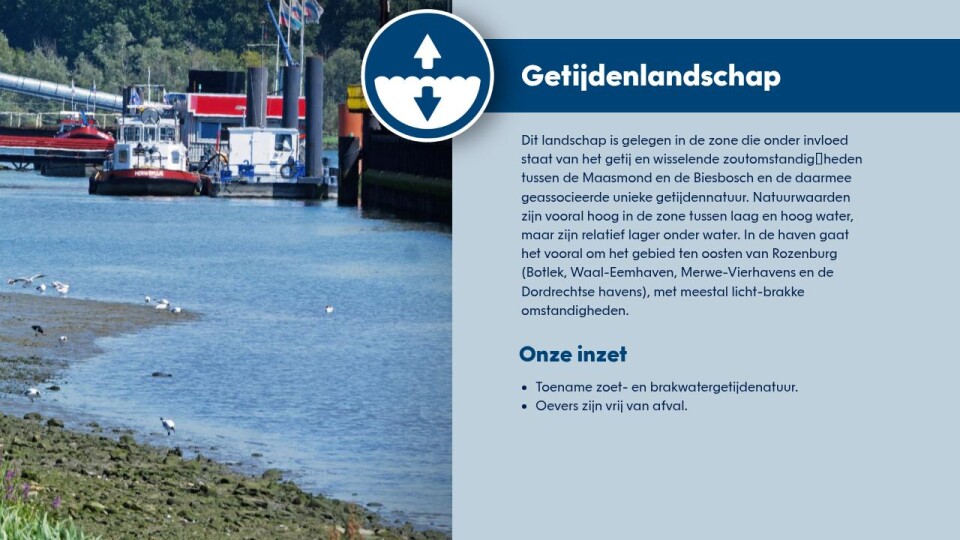 Dit landschap is gelegen in de zone die onder invloed staat van het getij en wisselende zoutomstandigheden tussen de Maasmond en de Biesbosch en de daarmee geassocieerde unieke getijdennatuur. Natuurwaarden zijn vooral hoog in de zone tussen laag en hoog water, maar zijn relatief lager onder water. In de haven gaat het vooral om het gebied ten oosten van Rozenburg (Botlek, Waal-Eemhaven, Merwe-Vierhavens en de Dordrechtse havens), met meestal licht-brakke omstandigheden.