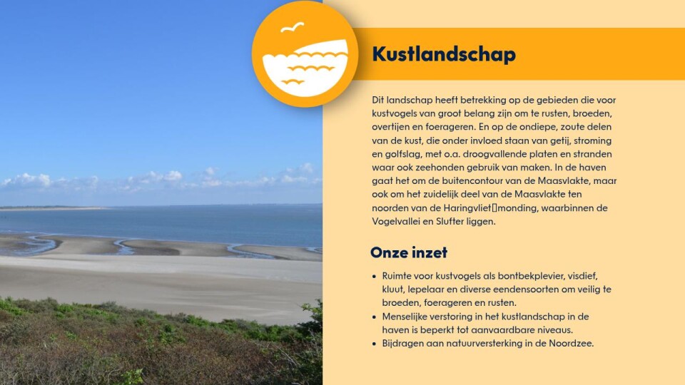 Dit landschap heeft betrekking op de gebieden die voor kustvogels van groot belang zijn om te rusten, broeden, overtijen en foerageren. En op de ondiepe, zoute delen van de kust, die onder invloed staan van getij, stroming en golfslag, met o.a. droogvallende platen en stranden waar ook zeehonden gebruik van maken. In de haven gaat het om de buitencontour van de Maasvlakte, maar ook om het zuidelijk deel van de Maasvlakte ten noorden van de Haringvlietmonding, waarbinnen de Vogelvallei en Slufter liggen.
