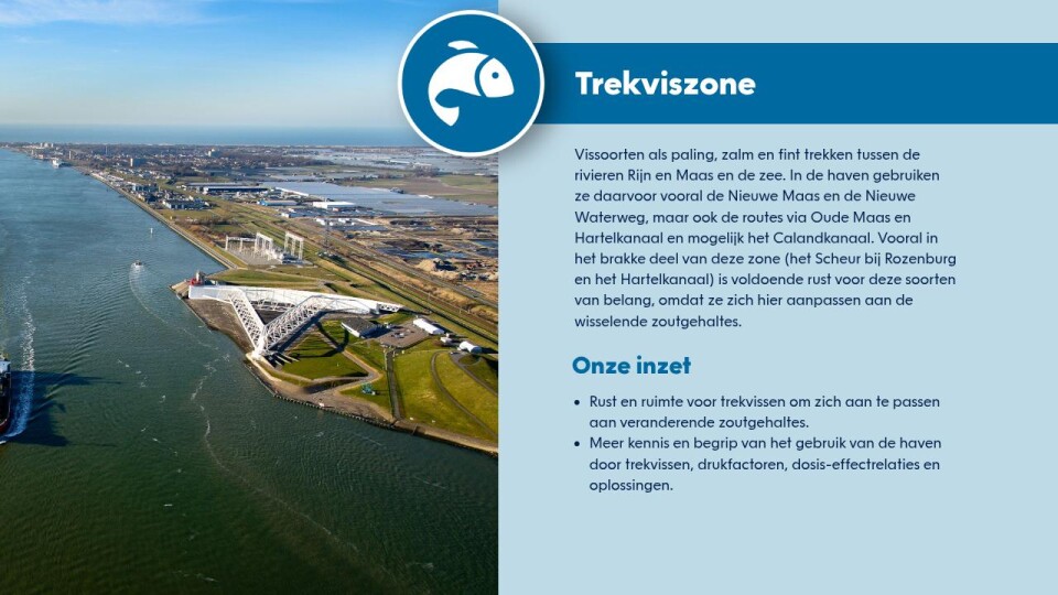 Vissoorten als paling, zalm en fint trekken tussen de rivieren Rijn en Maas en de zee. In de haven gebruiken ze daarvoor vooral de Nieuwe Maas en de Nieuwe Waterweg, maar ook de routes via Oude Maas en Hartelkanaal en mogelijk het Calandkanaal. Vooral in het brakke deel van deze zone (het Scheur bij Rozenburg en het Hartelkanaal) is voldoende rust voor deze soorten van belang, omdat ze zich hier aanpassen aan de wisselende zoutgehaltes.