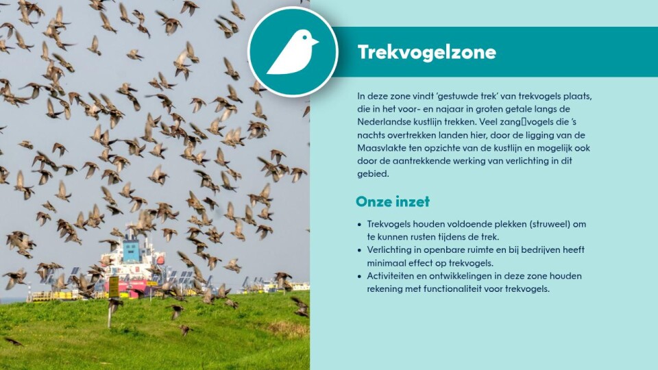 In deze zone vindt ‘gestuwde trek’ van trekvogels plaats, die in het voor- en najaar in groten getale langs de Nederlandse kustlijn trekken. Veel zangvogels die ’s nachts overtrekken landen hier, door de ligging van de Maasvlakte ten opzichte van de kustlijn en mogelijk ook door de aantrekkende werking van verlichting in dit gebied.