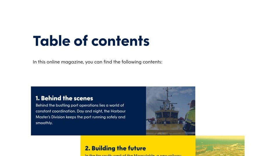 The following topics and events are highlighted: the Rotterdam Port Meeting, commuting to the port, the digital report, a new offshore wind terminal and the 2026 container outlook.